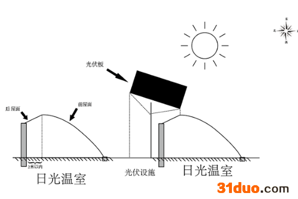 3.3 依托日光温室建设光伏设施的,光伏板高度应满足冬至日晴天9:00时后不影响后排棚室内作物种植的采光需求,且光伏板最低点不能延伸至温室的前屋面,温室后屋面水平投影长度不超过2米。