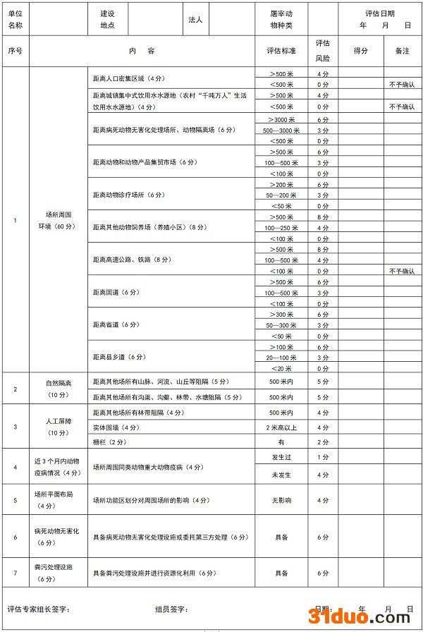 动物屠宰加工场所确认选址动物防疫风险评估表