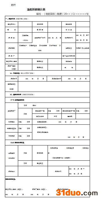 第八条 船舶所有人应当在渔船拆解前填写渔船拆解确认表(样式见附件),并向船籍港所在地县级以上地方人民政府渔业主管部门提交以下材料: