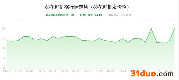 目前为止,葵花籽的整体价格平稳运行,而且走货量在增加,销区仍以消化库存为主。目前产地余货不多,好货较少,有少数产区价格稳中走强。预计,短期内葵花籽价格或稳定为主。具体行情走势如下图所示: