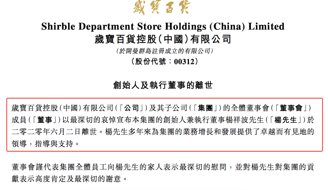 6月3日晚间,港股上市公司岁宝百货(00312,HK)公告,创始人兼执行董事杨祥波于6月2日离世,年仅58岁。