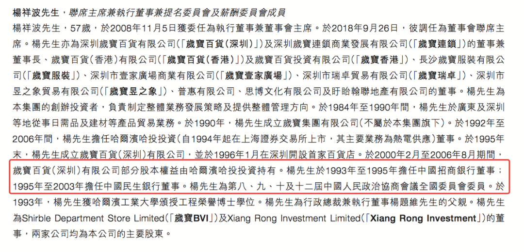 岁宝百货年报显示,今年杨祥波年龄58岁,2008年11月5日就担任岁宝百货执行董事兼董事会主席。可以说,岁宝百货为杨祥波一手缔造,并制定整体发展策略和提供整体管理方向。