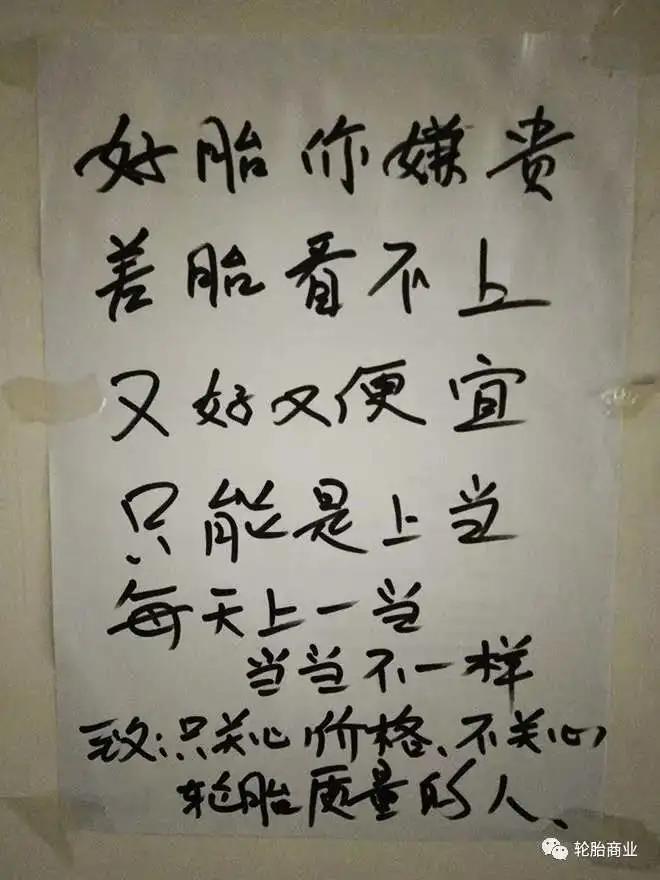 在轮胎行业,并非假货太多,而是人心太贪。顾客总在一味的追求物美价廉,其实世界哪有什么物美价廉,不过是给消费者的心理安慰。一分价钱一分货才是王道。还是那个故事,有人想买一款轮胎,他得到了三个报价:熟人报价是500,知己报价是480,陌生人报价300!结果,他选择了报价300的陌生人!却不知道熟人只挣了20块,知己一分没有挣;报价300的陌生人却狠狠的赚了200!因为陌生人卖的就是假轮胎,他也不会对你的生命安全负责,当出现问题,去寻找陌生人的时候,他也早已不见踪影。