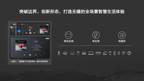 面向全场景智慧未来,华为基于独特的“芯-端-云”协同能力持续创新高品质的全场景一致体验,以“原生应用+快应用+快服务”的全场景数字服务布局打造5G时代全场景智慧生活,基于华为帐号实现高品质应用、内容和服务在全场景终端设备中的无缝流转,带来更智慧、便捷的数字生活体验。
