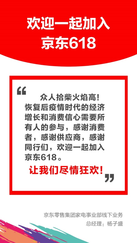 在用消费券等形式多样的优惠措施刺激消费的同时,京东也以开放的态度,与社会各界力量一起,以618为契机促进消费增长。京东零售集团家电事业部线下业务总经理杨子盛表示:“众人拾柴火焰高!恢复后疫情时代的经济增长和消费信心需要所有人的参与,感谢消费者,感谢供应商,感谢同行。欢迎一起加入京东618,共同为消费助力。”