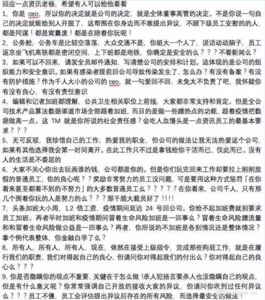 这是一般人的思维,也是现实,君不见这两天疯传的某网络公司要求员工提前上班引发的风波?该网络公司大年初三发通知要求外地员工返京上班,有员工不满,在社交媒体上斥责公司“置员工健康于不顾,想让员工都感染新型肺炎。为了自己的利益,坑员工。老板为了钱,要我们的命”等,没想到硬气的领导不怕事,直接写了8条回应,并建议不想返回加班的员工离开。结果炸开了锅,员工写了千字文,还向有关方面进行了举报。具体内容见图,暂不赘述,公说公有理,婆说婆有理。