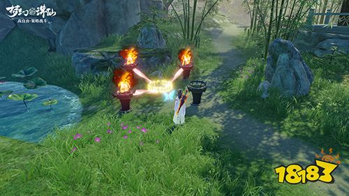 除了科学方法解谜,还有些特别的谜题会让你进入幻境,只要解开幻术就能获得福利。在野外你可能会见到闪着蓝色光圈的宝箱或雕像,这时只要将幻境中的幻蝶驱赶到指定位置,就能破除幻术。而一些闪着金色光圈的宝箱或雕像,则会触发火焰阵法,点燃熄灭的火焰就能破解法阵。