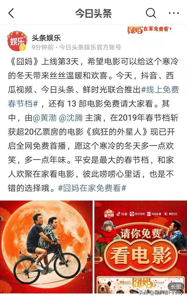 今日头条、抖音、西瓜视频打造“线上免费春节档”,还将有 13 部电影免费请大家看,具体影片看下图哦!