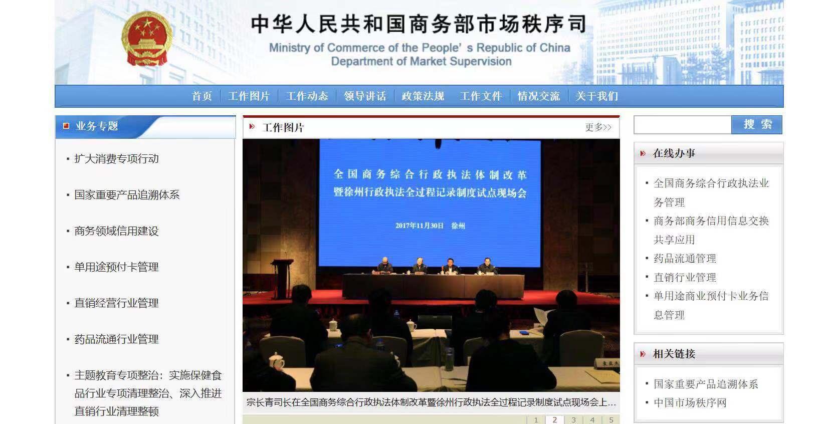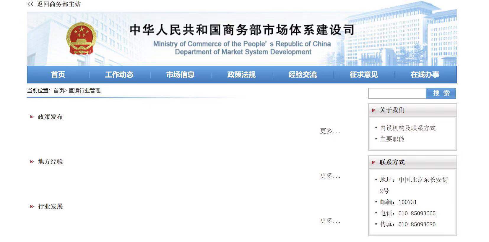近日,商务部官方网站对内设机构进行了部分调整。澎湃新闻()记者注意到,此前负责直销管理及内资直销企业的市场准入的市场秩序司已经无法在官网首页上找到,“直销行业管理”相关职能已被划归到市场体系建设司(下称“市场建设司”)。