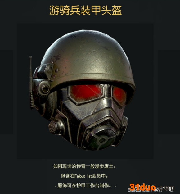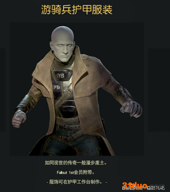 这套衣服常驻在1ST商店,只要你充值过1ST【是充值,免费的能不能领取我就不知道了】即可永久解锁此服装,此服装首次登场在前作辐射新维加斯里,是辐射世界美国洛杉矶警察局的一种装备,大致就是皮革大衣+牛仔裤+高级防弹衣+武装带+整合了红外线光学目镜、防毒面具和无线电以及防弹钢盔的一个头盔。