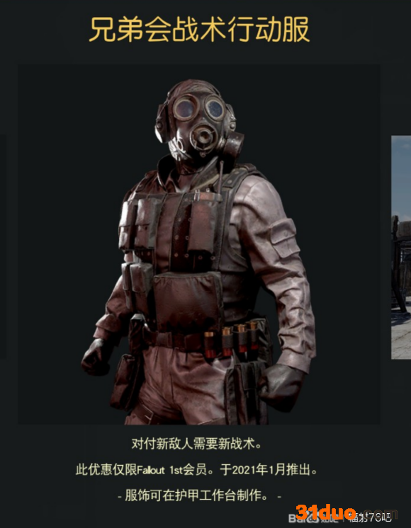 2021年1月推出,是上行线路掉落的兄弟会制服的异色版本,滤嘴式防毒面具+耳机+防弹衣+战术服装手套等的组合,创意应该源于现实里的军用装备。