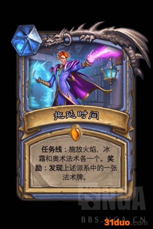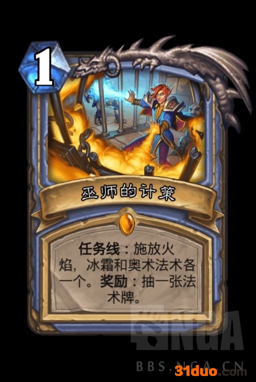 任务线总共需要冰火奥三系法术各3张,第一阶段的奖励是抽一张牌,算是小小的缓解了一下过牌的压力吧。