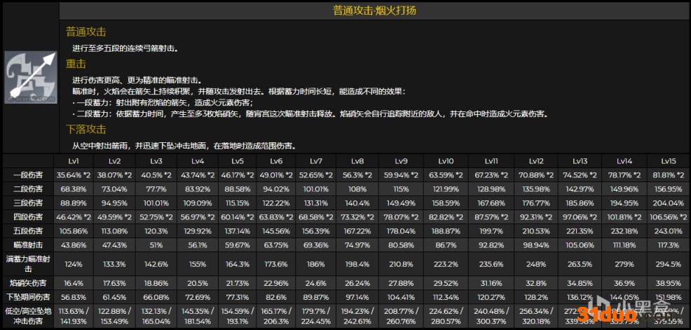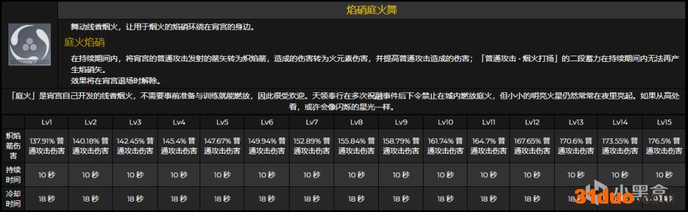 E技能是宵宫的核心技能,开E后将普通攻击造成的伤害转化为火元素伤害(转化和附魔的本质是不同的,即使出现了比火更高等的能附魔弓箭手的附魔形式,也不会改变宵宫E的火元素伤害类型;但以下为了简化描述,依旧把宵宫E称为附魔)。E技能附魔期间,宵宫的普攻造成的伤害会大大提升,提升倍率随着技能等级上升,可看作是个独立乘区。10级E技能,该独立乘区的值为1.6,此时宵宫的普攻DPA将高达406%,很恐怖的一个提升。