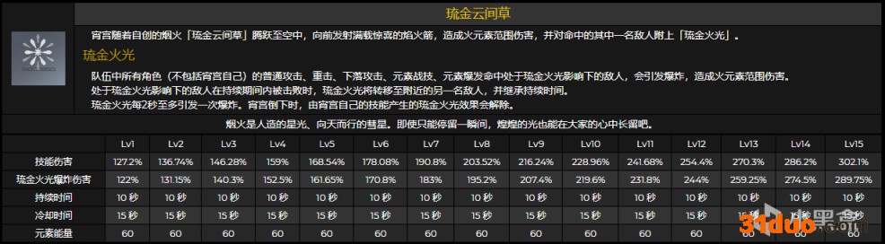 60级突破天赋:施放Q技能后的15秒内,队伍中角色(不包括宵宫)攻击力提升10%;此外,依据20级突破天赋的层数,每层额外提升1%的攻击力。意味着最多可以给队友带来20%的攻击力加成。
