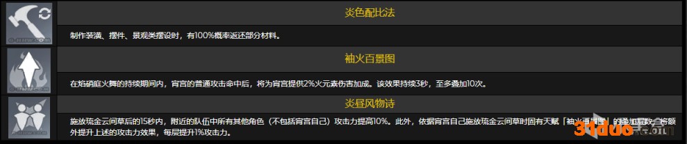 20级突破天赋:E技能持续时间内,每次普攻增加2%的火元素伤害加成,持续时间3秒,最多10层。这里我心存疑问的,因为普攻的正常打满五段就需要3秒钟,想要10层不可能的。然后就是普攻的第一段和第四段能否分别叠两次,这个得等上线实测啦;6命的附加攻击视为普攻伤害,是可以增加层数的。