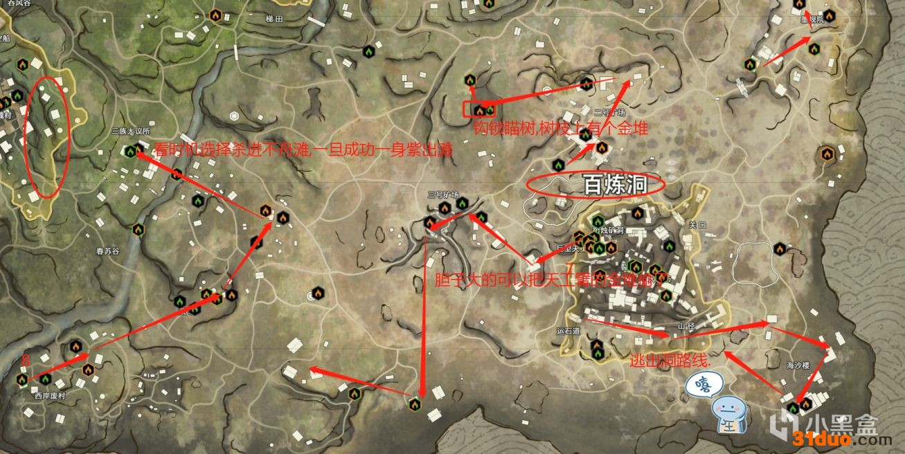 效率第一,切忌不要想着什么都捡,捡完再扔,一个蓝堆还得细品一下,甚至回头扔2钩锁,拿4个小甲粉.看什么看!说的就是你!争取在返魂还在的时候,效率提升硬件,打几场仗,死了就死了,重新跑一边,再苟起来.途中红圈为事故多发地,实力强的,大招还在的可以选择主动找架,没大招的时候还是以稳为主.
