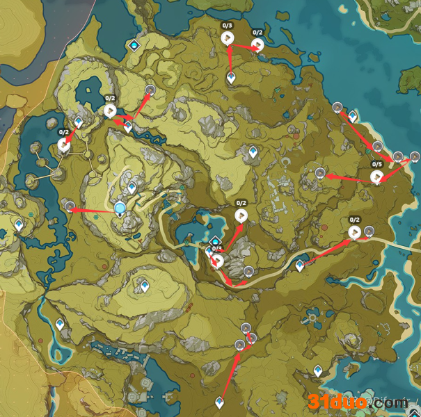 每日调查上限只有100个,按照这个路线就能拿完100个圣遗物调查点,不用跑全图。