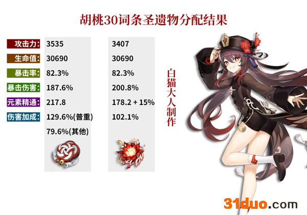 胡桃的模板为90级0命带1精90级护摩之杖,技能全都为Lv.9。因为胡桃吃的属性比较多,百分比攻击力、百分比生命值、暴击率、暴击伤害、元素精通,所以针对胡桃自身的模板进行30词条的属性随机分配求最大值,这是分配后的结果。