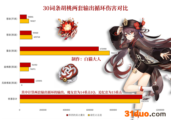 普重的意思是普攻重击。接下来针对具体机制我做一些比较细致的讲解。胡桃的A重循环中,平A是存在附着CD的,为100形式,重击则无附着CD,可以连续蒸发。因为魔女套也不能保证每次输出循环中都有元素爆发,所以我们计算的是两轮输出循环打一个元素爆发,追忆套则不打元素爆发,但是会在这段时间内多打一个重击。关于连续重击的次数,我们一轮循环取比较保守的7次来计算,也就是魔女套两套循环是14次A重+1次元素爆发,追忆套则是15次A重。因为上述平A有附着CD的影响,14次A重中,第1 4 7次可以反应,2 3 5 6次不行。至于血梅香和元素爆发,我们则默认都可以吃到蒸发。在此基础上我们进行数值伤害模拟,默认配置为胡行钟。