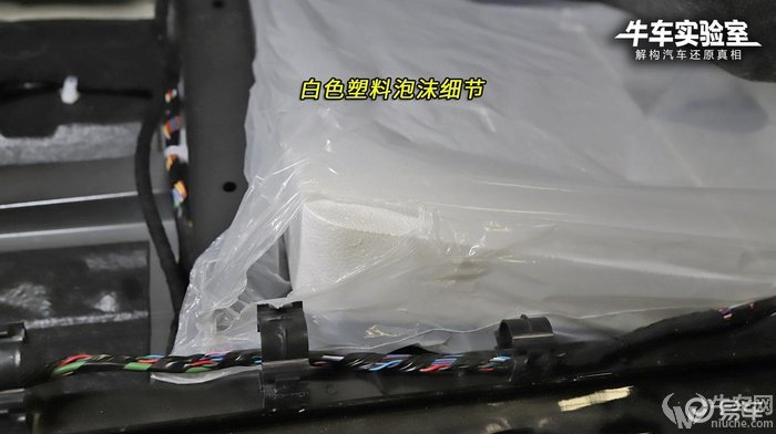 掀开地毡,下面露出的白色塑料泡沫真的让人很吃惊。这种材料和常见的泡沫并没有什么区别,只是上面多了一层塑料袋包装。也有不少车会在地板局部使用塑料泡沫,但从来没见过带着塑料袋的。轩逸为什么要如此设计呢?工人懒得撕掉包装?