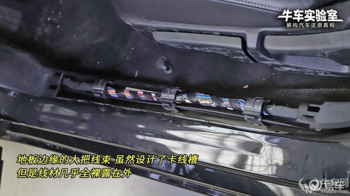 地毡仅有一层,下面的线束还没有什么防护,在车里喝饮料要当心了。有液体洒了还真是比较危险,地板没有防水防潮层,要是造成线束周边有湿气可不是什么好事。