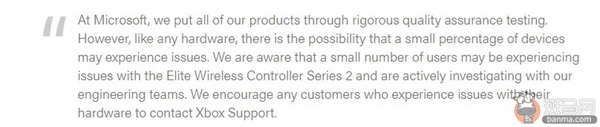 “在微软,我们所有的产品都经过了严格的质量保证测试,但和任何硬件设备一样,一小部分设备可能会出现问题。我们已意识到少数用户可能遇到了Xbox二代精英手柄的问题,正与我们工程团队积极调查,希望任何遇到问题的客户与Xbox客服联系。”