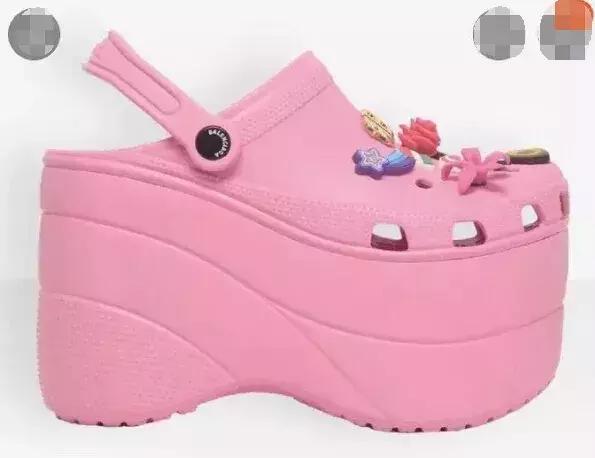 当然,巴黎世家并不孤独,它还有很多审美相近的好朋友。Crocs曾推出一款号称好看又舒适的高跟鞋,而那款鞋的实际长相用网友的话说就是“楼下散步大爷的拖鞋加了个跟”。