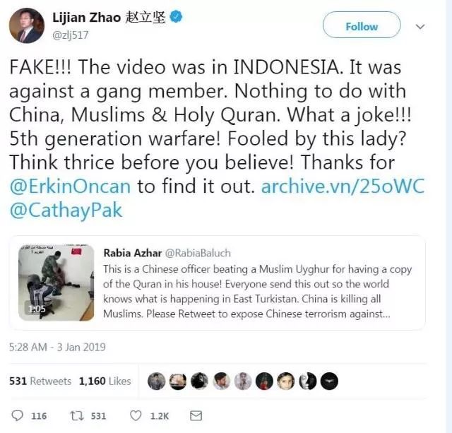 2018年12月31日,推特上一个名叫Rabia Azhar的女子发布消息称,一名中国新疆(原文:东突厥斯坦)的穆斯林遭到警察“毒打”,仅仅因为这个穆斯林在“抄写古兰经”。她还配了一段视频,视频中有一名男子正在被一名穿着迷彩服的男子殴打,还有一名身穿深色制服戴白色头盔的男子站在一旁观看。