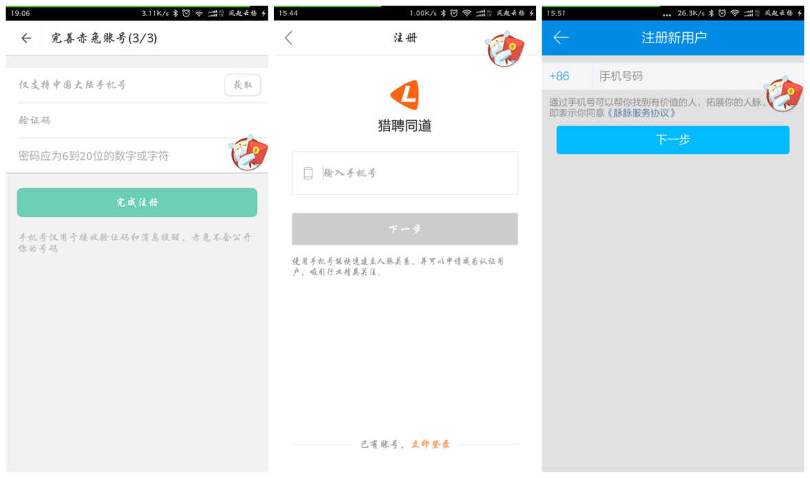 首次使用时,三款软件均需登陆账号,赤兔可以使用领英账号登陆,其他两款则必须使用软件账号登陆,相比来说赤兔软件更加方便。注册账号则均是通过手机号码进行注册。