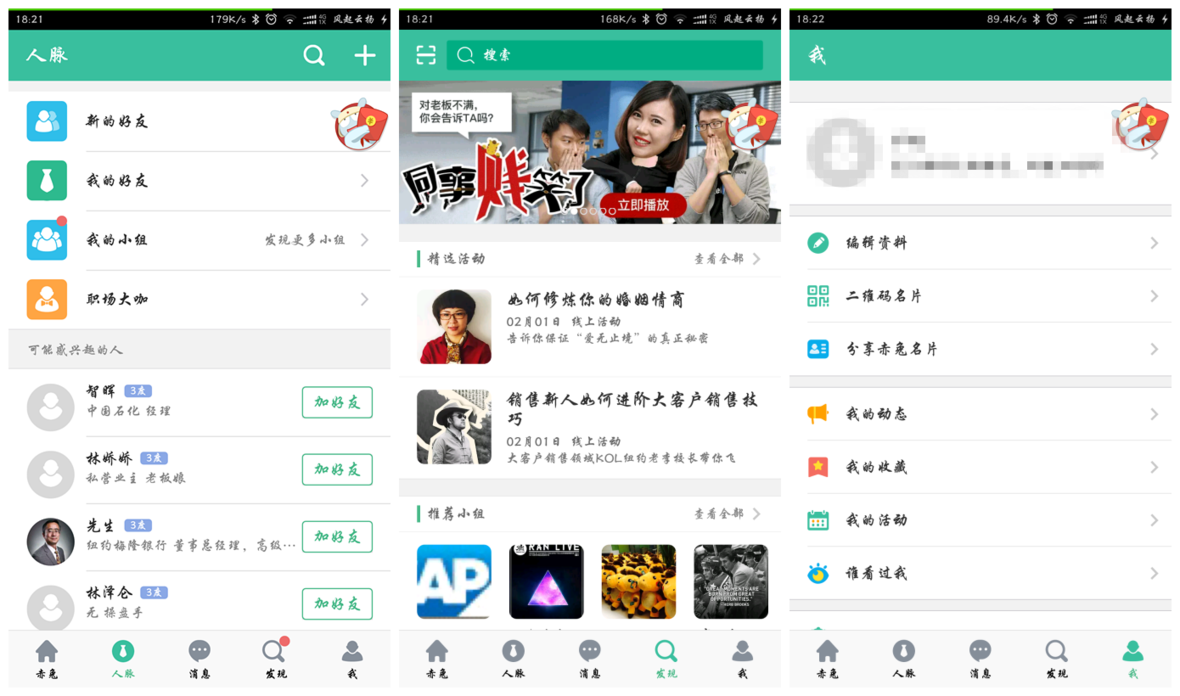 赤兔APP底部分为五个模块,赤兔,人脉,消息,发现和我。特色功能则集中在人脉,发现和我这三个版块。人脉部分除了添加通讯录好友外,还提供了多种好友的添加方式,也可以关注众多职场大咖,让更多人生导师指引你。发现部分则提供了丰富的线上活动,对于初入职场尚处于迷茫期的年轻人来说,更多的线上活动不仅仅可以扩展社交圈,可以丰富业余生活,尽快度过初入职场的不适应期。在个人资料部分,二维码名片和方便的分享名片功能也使得其社交属性更强。