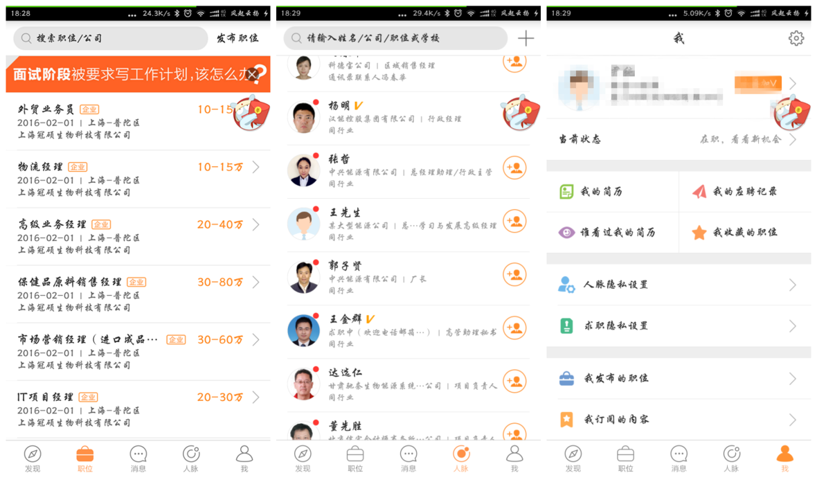 猎聘同道APP底部同样为五大模块,发现,职位,消息,人脉和我。其中发现与消息都属于社交软件基本应用,主要的特殊部分集中在职位,人脉和我。职位部分可以根据适当的筛选条件显示相应的职位,依托于猎聘网的数据,猎聘同道可以更加有效的完成求职与招工,社交属性的加入也让求职者和招聘者可以更加方便的沟通,也更有助于互相了解。人脉部分则可以推荐相近行业的好友,这一点相比其他两款APP都更加精准,不过相比来说也更加有局限性。个人资料部分则加入了简历部分,通过APP同样可以完成简历与求职的步骤。
