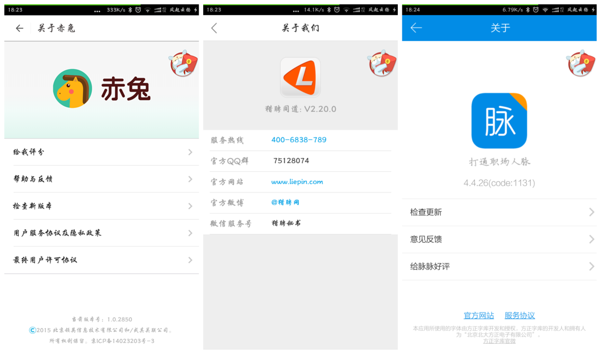 为了保证对比的合理性,三款软件均已升级到最新版本。具体的版本信息如下图,从左至右分别为赤兔,猎聘同道和脉脉,后文中也采用同样的顺序,就不再一一标注了。