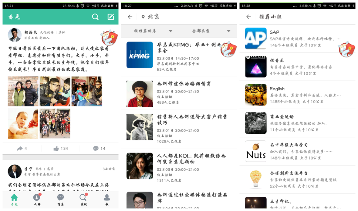 赤兔APP由于其背后的领英中国的强大影响力,虽然还未上线招聘、求职相关的功能,其泛职场相关的功能也相当的丰富多彩。人气上,有各种各样的大咖加入,比如最为著名的人生导师李开复,兼职做天使投资人的明星组合羽泉,奥运体操王子李宁等。众多大咖的加入让赤兔APP的人气在发布不久便得以飙升,也让受众群体能有更多与偶像直接沟通的机会。各种各样的线上活动也让各类职场新人有更多的机会扩展社交网络,打发空闲时间,提升自身的含金量。兴趣小组更是可以聚集众多有相同兴趣爱好的小伙伴一起交流探讨,提升交流的方式。