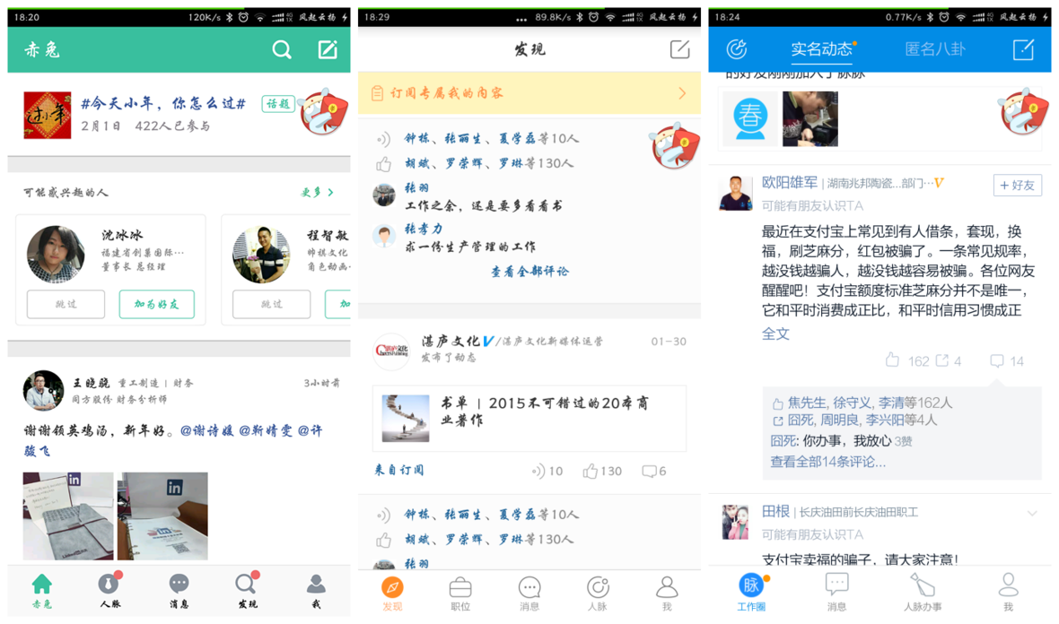 主页面方面,三款软件都很相似,均采用了类似微博或者微信朋友圈的形式展现。对于用户来说,这样的展现方式更加直观方便,上手也相对简单。相比之下,赤兔采用的是更加接近微信朋友圈的展示方式,主打图片,对于年轻人来说更加具有吸引力。猎聘同道和脉脉均采用了类似微博的展现方式,更加看重文字的效果。配色方面,三款APP各不相同,赤兔更加活泼,猎聘同道则略显单调,脉脉则显得比较沉稳。对于不同的用户群体,各有各的优势。
