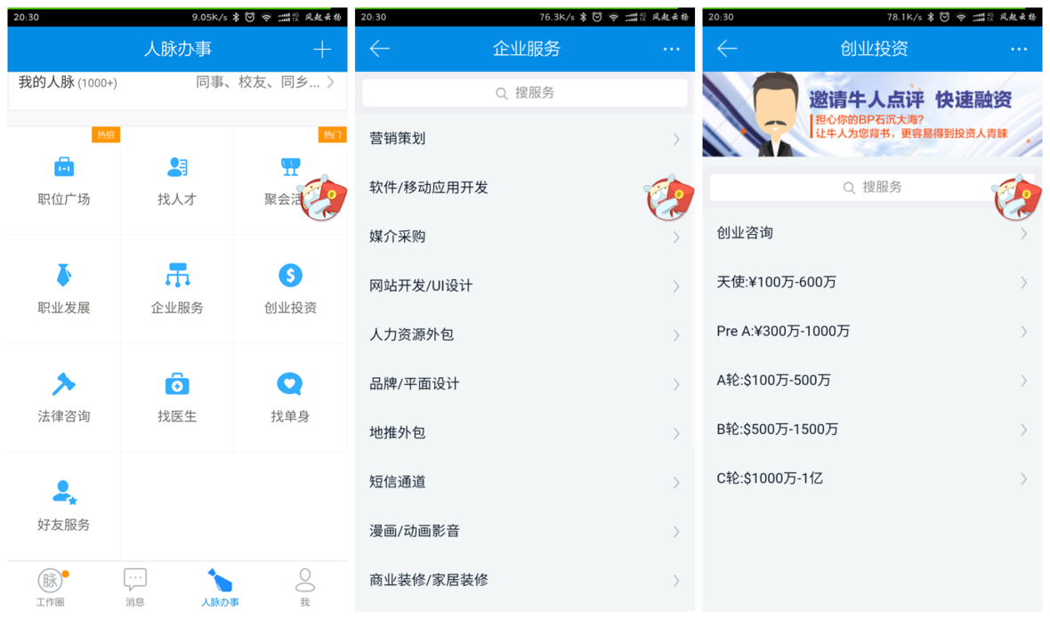 脉脉则充分利用了各种人脉资源。找人才,找医生,甚至连找单身都有了。各种服务的提供为用户提供了各种便利。而对于创业的用户来说,各种各样的企业服务也充分发挥了人脉的优势,连创业投资都可以通过脉脉来完成。