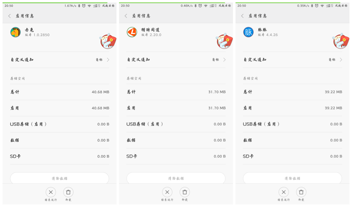 三款APP在安装体积均在30-40M之间,整体来说都不算太大。对于用户手机的负担也比较轻,相比于微信微博动则80M左右的体积来说,这几款软件可以算是轻量级的产品了。