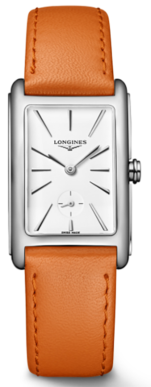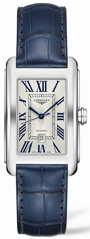 银色“flinqué”饰纹的表盘搭配漆绘罗马数字和蓝钢指针,有一种复古绅士的感觉。6点钟位置的小秒盘同样设计成方形,符合整款腕表的设计理念。12点钟位置有“LONGINES”字母和玫瑰金材质的飞翼沙漏标志。这款腕表搭载自动上链机械机芯,适合每日佩戴,让爱意常常相伴。