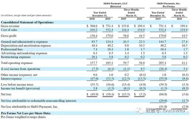 Shift4在2018年、2019年净亏损分别为4990万美元、5810万美元;Shift4在2020年第一季度净亏损为520万美元,上年同期的净亏损为1350万美元。
