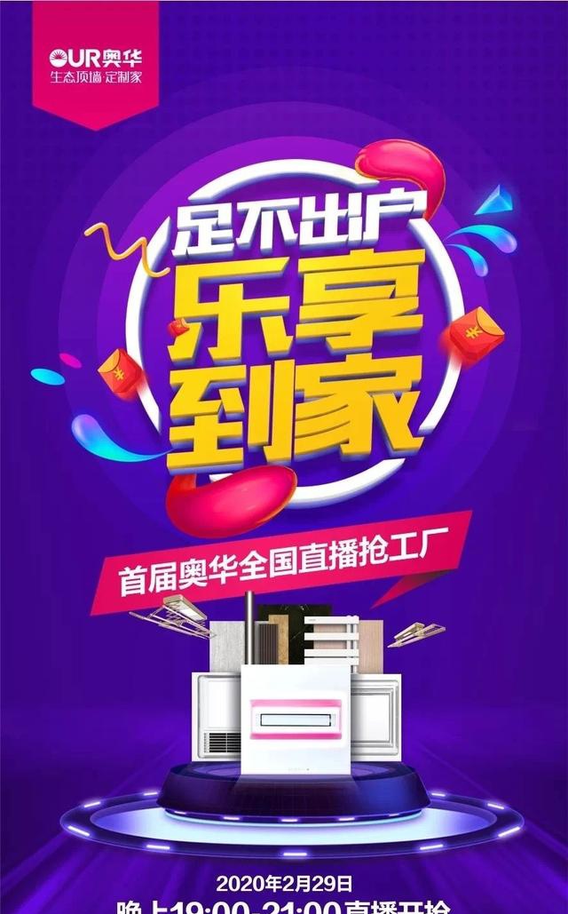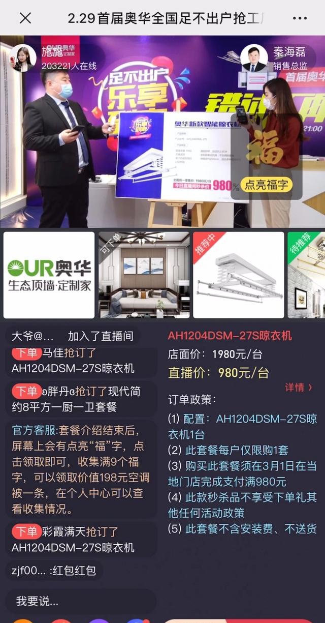 “皮卡皮卡抢订了现代轻奢8平方米PLUS版厨卫套餐”、“清心抢订了4平方米厨房顶”、“小刘抢订了现代简约8平方米一厨一卫套餐”……2月29日19:00,奥华吊顶直播间,随着下单、秒杀的消息不断刷新屏幕,销售部总监秦海磊身着正装、头戴口罩,左手握产品,右手持手机,将奥华产品的特点向观众娓娓道来,俨然化身带货主播。“这是时下火热的8平方米的一厨一卫套餐,包含有4款颜色可选的8平方米扣板、300*300的LED平板灯、最新款空调型取暖器等,原价5466元/套,当天活动价仅需2380元/套,让利价格超过五折。”在秦海磊的介绍下,活动步入高潮,同时在线万人。