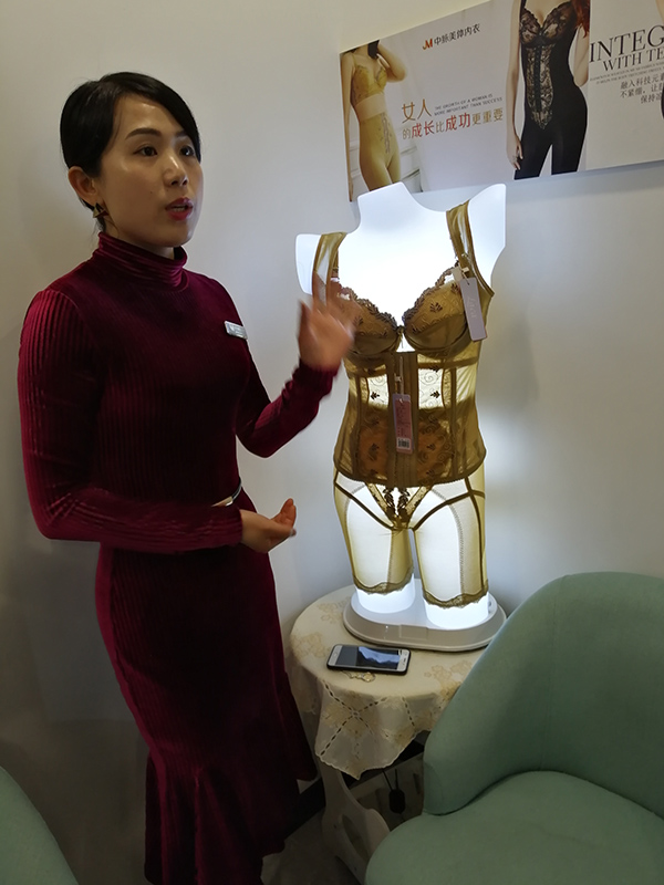 询问了记者的年龄,职业和家庭情况后,“张曼雪”和“冯子煜”开始介绍美体行业的市场前景、中脉Laca内衣的与众不同。“能量石”、“红外线”等半生不熟的高科技词汇,频繁出现在介绍中。 他们称,这款内衣不仅能塑形,还能调理身体,因为内衣中缝制了“能量石”,且内衣材质含有“红外线”,“红外线有杀菌作用,可以帮我们清除污垢”,因此这款内衣是不需要频繁清洗的,“冬天半个月洗一次,夏天一周洗一次”。一位名叫“王婷”的“设计师”又过来介绍,中脉Laca内衣系从美国进口的“莱卡面料”,透气性比棉和麻高8-12倍。