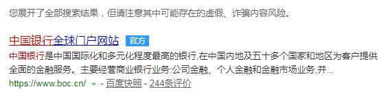 点击“我已知道可能存在的风险”,展开隐藏的其他搜索结果后,才能找到中国银行的网址。在中国银行网站链接的上方,百度警示道:“请注意其中可能存在的虚假、诈骗内容风险”。