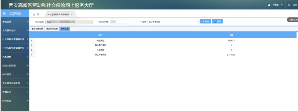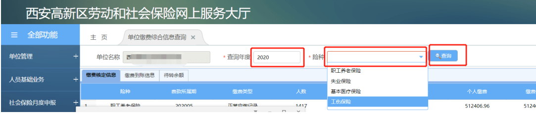 参保单位可登录高新社保网厅,在“综合查询-单位缴费综合信息查询”模块选择险种,输入相关年度,即可查询到“单位缴费核定信息、缴费到账信息、待转金余额”等相关信息。