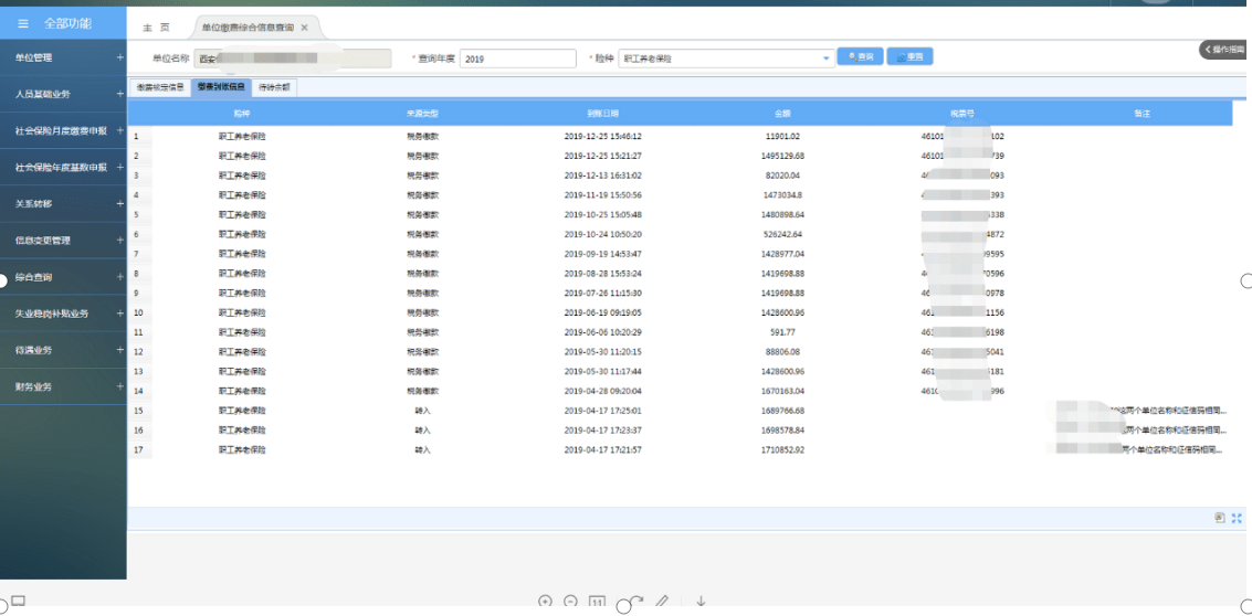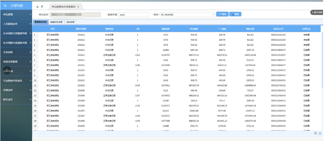 注:单位缴费核定信息、缴费到账信息仅展示2019年1月之后的信息。医疗、工伤、失业等险种因税务共享原因, 2019年3月和4月没有税票号,若单位足额缴纳则直接结算。