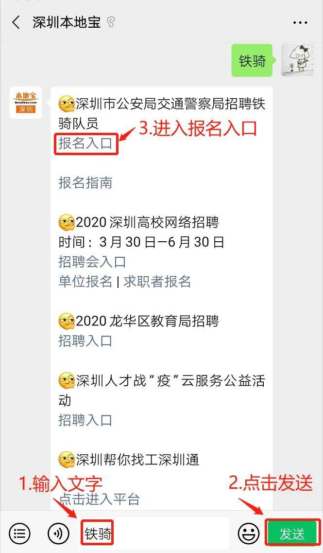 本次公开招聘报名采取网络报名的方式进行,不接受现场报名。报名人员可通过深圳市公安局交通警察局互联网门户网站(、深圳交警官方微博及微信公众号(“深圳交警权威发布”)、深圳市考试院发布公告中的相关链接进行登录报名。在深圳本地宝微信对话框发送【铁骑】也可以获取报名入口。