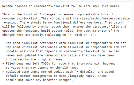 ▲图为谷歌Chrome浏览器的程序人员给出的移除“”黑名单”以及“白名单”等用语的建议和步骤