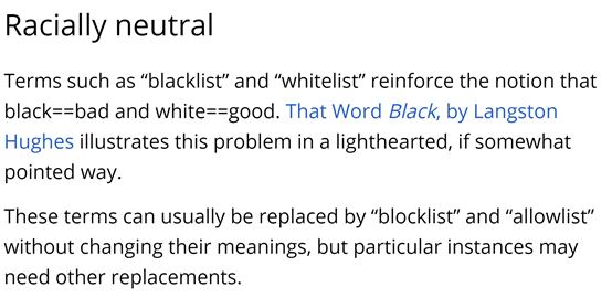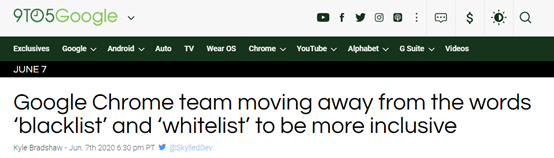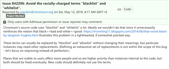 从的报道来看,其实在去年10月甚至在2018年5月的时候,Chrome浏览器的开发团队其实就已经开始鼓励程序员们在使用其开源代码时,避免使用“黑名单”和“白名单”这两个词了,其原因是这两个词语会加重人们对于“黑是不好的,白是好的”这种有种族主义之嫌的认知,并建议将这两个词更换为“屏蔽名单”(Blocklist)和“允许名单”(Allowlist)。