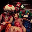 深蓝色的沙发背景墙在橘黄灯光下带着紫蓝色的梦幻,与黄绿色质感沙发,红色复古造型的落地灯撞色的处理非常抢眼,而也意外多了一丝中式禅韵的感觉。