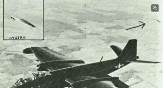 1957年9月,一名试飞员在美国加利福尼亚州爱德华兹空军基地附近拍摄到这张照片。照片显示,一个UFO在跟踪一架B-57喷气式轰炸机。