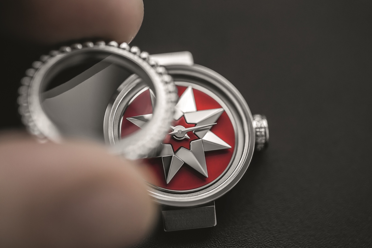 表面上,仅有时针与分针,并没有其他记号或孔圈:以最简单的表达方式来启示时光的意义。它结合了钟表师与珠宝匠的专业工艺于一身。在表背,用手转动的石英或Zenith机芯,符合制表工艺的严格规定。