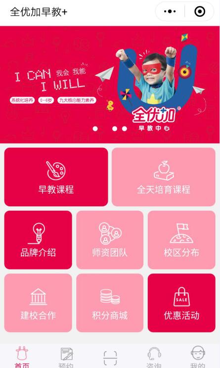 全优加早教小程序经过半年的开发,完成了所有功能的优化和升级,针对0-6岁的宝宝,建立了九大核心能力素养的系统化培养。小程序目前已具备5大菜单栏,其中有首页展示、预约、AR娱乐、咨询和会员管理的功能。而首页有8大展示功能,其中有课程展示、品牌介绍、校区分布、优惠活动等,预约功能可以帮助客户定位最近的校区进行预约,AR功能是配合品牌做营销活动的娱乐功能。完整的功能开发,给客户带来良好的体验,同时也为各分店带来了流量。